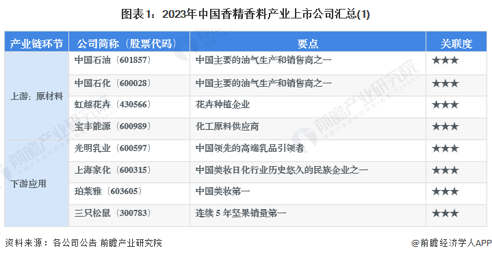 香精香料行业的产业链上游主要为原材料供应商,包括石油化工企业和香料植物种植企业等;下游为食品、日化等行业企业,代表性上市公司包括三只松鼠、上海家化等。香精香料行业产业链上下游的主要上市公司汇总如下: