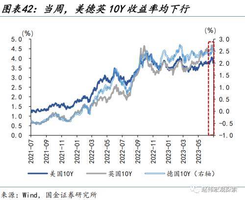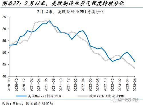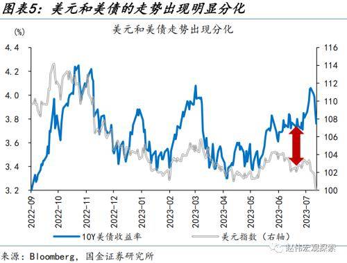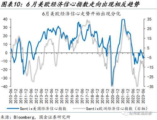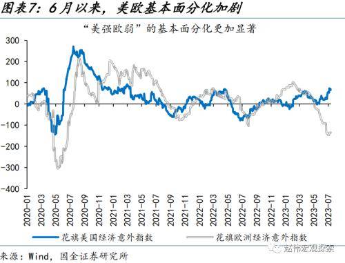 1)6月以来,美元持续下行,近期更是加速回落、跌破100关口。通胀低预期、美联储官员放鸽下,加息预期的大幅降温,无疑是美元快速下行的主要驱动。但本轮下行中,出现了一些“异象”:美债与美元走势一度出现分化;美欧基本面的分化也不支撑美元走弱。美债与美元走势一度出现分化,美债大幅上行45bp、美元却明显贬值,本轮的背离,并非源自欧债收益率更快上行的影响,10Y德债收益率仅上行35bp,美德利差也在走阔。基本面上,美国经济韧性显现、欧元区进一步走弱,也与美元走势背离。