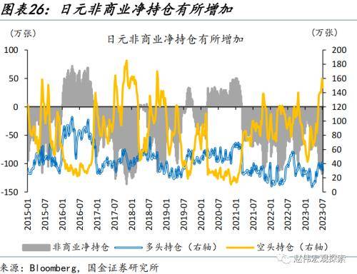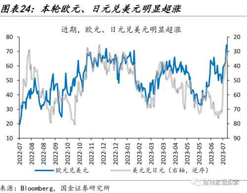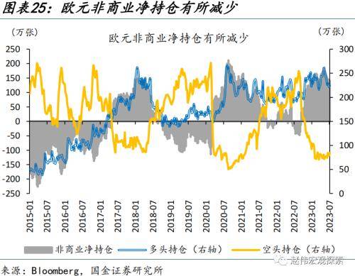 短期来看,欧洲金融条件已摆脱了银行业危机的冲击,近期资金回流对欧元的推升或将放缓;RSI等交易指标也显示,近期美元指数或有超跌。从彭博金融条件指数来看,5月底欧元区金融条件触底后,近期明显回升、已基本回升至本轮加息周期的收紧路径,脱离了银行业危机的冲击。这意味着,前期避险资金回流欧洲对欧元的影响或将逐步放缓。从交易层面指标来看,欧元、日元均升破70、非商业持仓由极值回落,均显示美元或有超跌。
