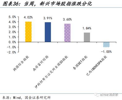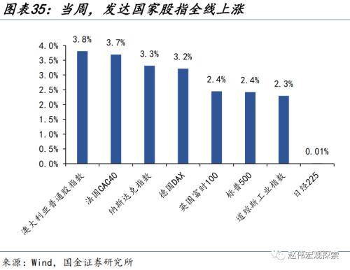 发达国家股指全线上涨,新兴市场股指多数上涨。澳大利亚普通股指数、法国CAC40、纳斯达克指数、德国DAX和英国富时100领涨,分别上涨3.8%、3.7%、3.3%、3.2%和2.4%。韩国综合指数、南非富时综指、伊斯坦布尔证交所全国30指数和泰国SET指数分别上涨4.02%、3.91%、3.60%和1.84%,仅巴西IBOVESPA指数下跌,跌幅为1.00% 。