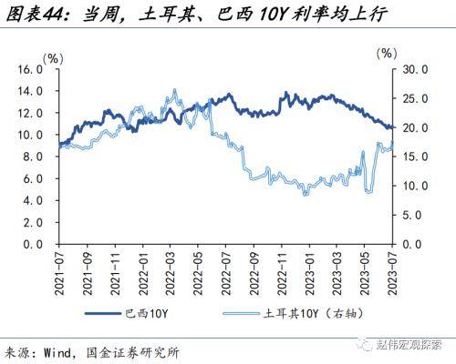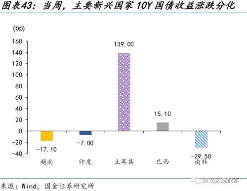 新兴市场10年期国债收益率涨跌分化。土耳其10Y国债收益率上行139.00bp至17.61%,巴西10Y国债收益率上行15.10bp至10.79%;印度、越南和南非10Y国债收益率分别下行7.00bp、17.10bp和29.50bp 。