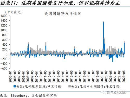 美债发行速度符合市场预期节奏、短债超发但期限利差反而缩窄,可见美债供给因素并非本轮美元与美债分化的主因。有观点认为,6月以来的美债与美元分化主因美债上限问题达成后,供给激增对美债收益率的大幅推升,但数据并不支撑:第一,近期美债发行加速、以短期为主,6月净增的5200亿适销美债中91%均为短债,但供给扰动并不明显;6月1日至7月7日,3个月美债收益率下行4bp、期限利差反而收窄41bp。第二,从竞拍倍数来看,美债并未“滞销”,各期限美债竞拍倍数不降反升。第三,当下市场流动性较充裕,一级交易商、投资基金购买了6月新发中的86%,市场有能力消化美债的供给。