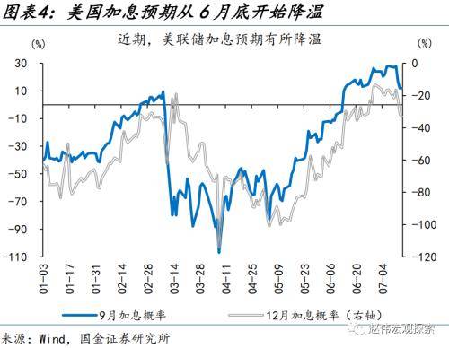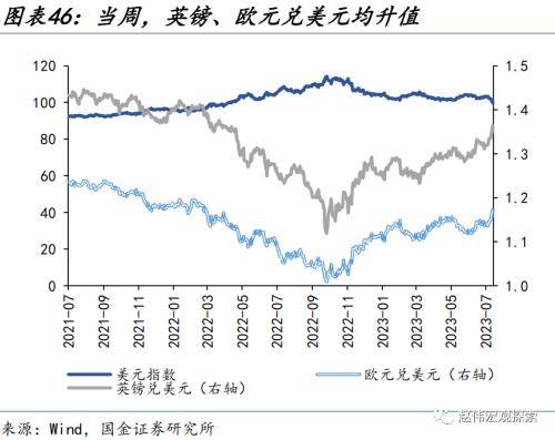 6月以来,美元持续下行,近期更是加速回落,快速跌破100关口。5月31日至7月13日间,美元由104.7的高位快速下行,期间大幅回落4.1%、并一度走低至99.57。通胀低预期、美联储官员放鸽下,加息预期的大幅降温,无疑是美元快速下行的主要驱动。一方面,6月美国CPI、核心CPI分别超预期回落至3.0%、4.8%;另一方面,6月非农数据公布后,美联储官员也“鸽”声渐起,布拉德的辞职更是使坚定加息的阵营中少了一员大将。截至7月13日,市场对9月加息的预期由28%快速下修至12%,美元也随之大幅回落。