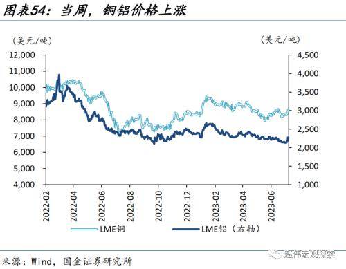 铜铝价格上涨,贵金属价格均上涨。LME铜上涨4.26%至8666美元/吨,LME铝上涨6.45%至2268美元/吨。通胀预期从前值的2.27%下降至2.24%。COMEX黄金上涨1.52%至1954.80美元/盎司,COMEX银上涨8.16%至24.98美元/盎司。10Y美债实际收益率从前值的1.79%降至1.59% 。
