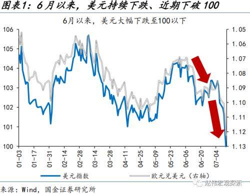 6月以来,美元持续下行、快速跌破100关口。本轮下行中,美元与美债走势一度分化、美欧基本面的分化也不支撑美元走弱。背后的原因、后续的演绎?本文分析,供参考。
