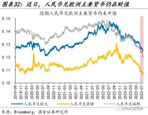近期美元的快速贬值使人民币贬值压力明显缓释;但中期来看,美元回落空间有限、人民币升值仍需内生动能催化。近期美元指数的快速回落,使人民币前期较大贬值压力明显弱化、人民币兑美元由6月30日的7.27快速升值至7月14日的7.14。但人民币兑欧元、瑞郎仍在快速贬值,可见人民币并未进入趋势性升值阶段。向后看,无论是美欧货币政策的收敛还是美欧基本面的分化均不支撑美元大幅走弱。外因支撑有限的背景下,人民币升值仍需内生动能的催化,稳增长政策是7月市场博弈焦点,对后续人民币走势至关重要 。