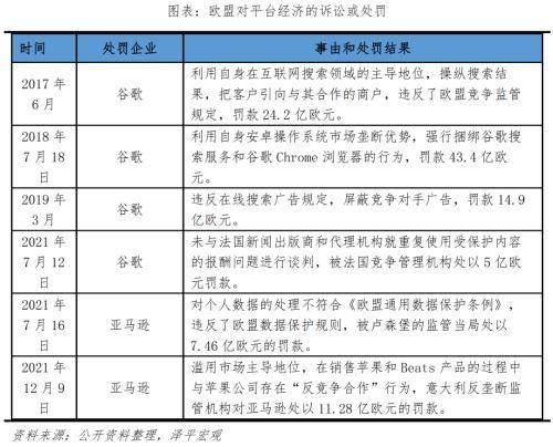 处罚方面,欧盟已经对谷歌因违反反垄断法而处以总计82亿欧元的罚款,并对亚马逊、苹果和Meta展开了多次积极调查。
