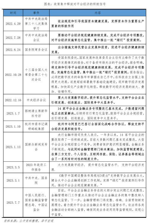 平台经济暖风频吹。2022年12月中央经济工作会议强调,要大力发展数字经济,提升常态化监管水平,支持平台企业在引领发展、创造就业、国际竞争中大显身手。2023年2月,中共中央、国务院印发《数字中国建设整体布局规划》,做强做优做大数字经济。7月7日,中国人民银行、国家金融监督管理总局、中国证监会联合发布《金融管理部门善始善终推进平台企业金融业务整改 着力提升平台企业常态化金融监管水平》,标志着对平台企业金融业务迈入常态化监管。