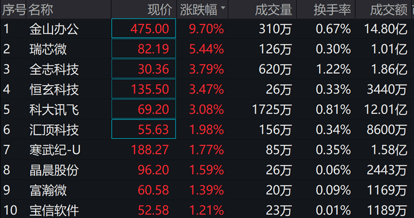 人工智能ETF(159819)紧密跟踪中证人工智能主题指数,该指数现涨1.17%。指数成份股中,金山办公上涨9.7%,瑞芯微上涨5.44%,全志科技、恒玄科技等个股跟涨超3%。