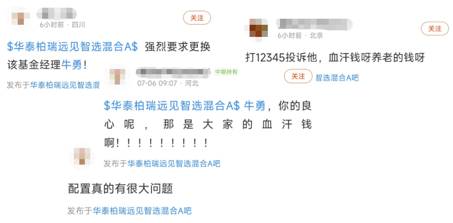 有人强烈要求换基金经理,有人要投诉,有人说基金配置有问题,还有人说基金经理没良心,总之华泰柏瑞远见智选的评论区戾气相当重。