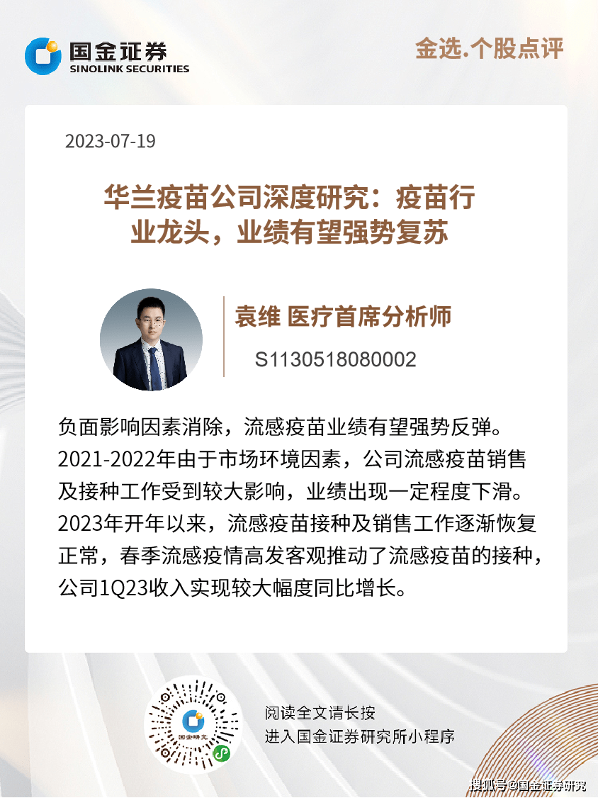 负面影响因素消除,流感疫苗业绩有望强势反弹。2021-2022年由于市场环境因素,公司流感疫苗销售及接种工作受到较大影响,业绩出现一定程度下滑。2023年开年以来,流感疫苗接种及销售工作逐渐恢复正常,春季流感疫情高发客观推动了流感疫苗的接种,公司1Q23收入实现较大幅度同比增长。目前流感疫苗销售及接种相关负面影响因素已经出清,结合公司四价流感疫苗儿童剂型有望进一步放量等因素,我们预测2023年公司流感疫苗销售收入为25.26亿元,实现强势反弹;此外,公司狂犬疫苗及破伤风疫苗已获批并将上市销售,公司盈利能力有望持续提升。