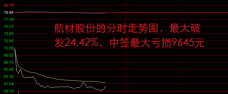 航材股份的开盘价为70元,较发行价78.99元低开11.38%,随后股价一路震荡走低,截至发文,航材股份最大破发24.42%至59.70元,若有中签股民在此价位卖出的话,中签最大亏损为9645元。接近万元的亏损金额,真的很难让中签缴款的股民“平静”。
