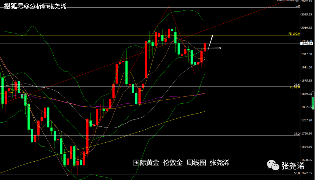 周线级别:金价上周延续前两周触底回升止跌看涨形态后,如期大幅上涨收阳,虽然未突破中轨线阻力,但主图下方均线支撑众多,本周就此产生的买盘支撑也大幅跟进,推动金价突破阻力压制,并持稳于此上方,看涨力度及预期再度增强,暗示后市将有进一步走强触及2000美元或2015美元附近的前景。下方将以中轨线支撑进行入场操作。