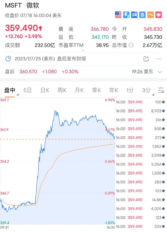 美东时间7月18日周二,微软大涨近4%,股价触及历史新高且今年以来已涨近50%,最新报359.49美元/股,最新总市值2.67万亿美元。
