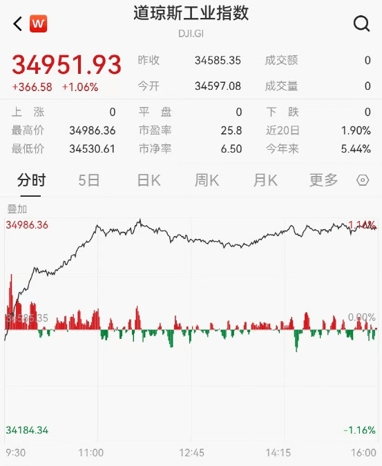 截至收盘,道指涨366.58点,涨幅为1.06%,报34951.93点,实现七连涨,创自2021年3月以来的最长连涨纪录;纳指涨108.69点,涨幅为0.76%,报14353.64点;标普500指数涨32.19点,涨幅为0.71%,报4554.98点。