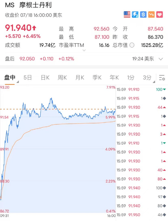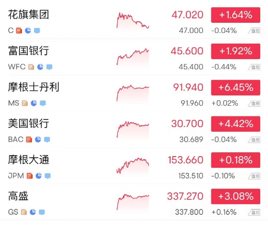摩根士丹利收涨超6%创3月以来最大涨幅;美国银行二季度盈利大增,股价涨超4%。银行股普遍上涨。
