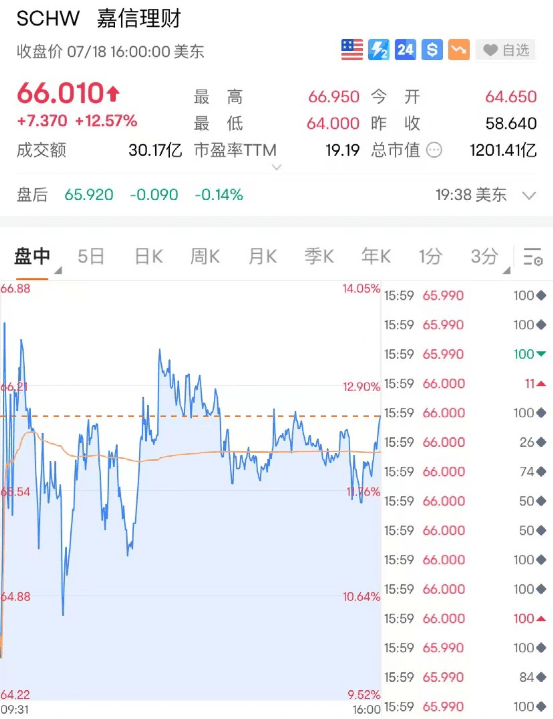 美东时间7月18日周二,8万亿美元资管巨头嘉信理财(Charles Schwab)收涨超12%,创2020年3月以来最大涨幅。