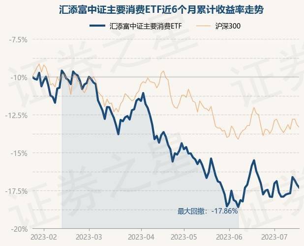 7月18日,汇添富中证主要消费ETF最新单位净值为0.9372元,累计净值为3.7488元,较前一交易日下跌0.47%。历史数据显示该基金近1个月下跌4.06%,近3个月下跌7.9%,近6个月下跌14.57%,近1年下跌14.75%。该基金近6个月的累计收益率走势如下图: