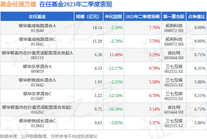 截止2023年二季度末,基金经理方建旗下共管理8只基金,本季度表现最佳的为银华集成电路混合A(013840),季度净值涨7.76%。