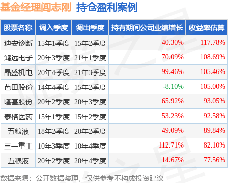 闾志刚管理的信诚四季红混合基金在15年1季度买入迪安诊断,在持有1个季度后在15年2季度卖出。持有期间的估算收益率为117.78%,持有期间迪安诊断在2014年到2015年的年报归属净利润增幅达40.3%。