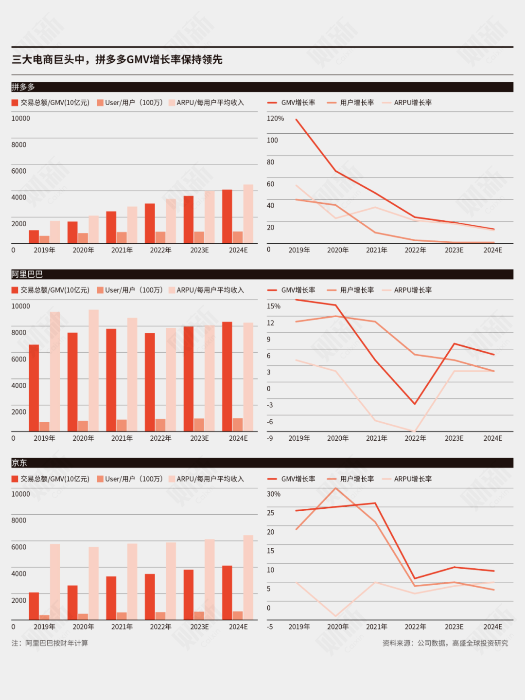 此外,拼多多的GMV也在持续上涨。高盛投资研究的数据显示,自2022年起,拼多多GMV增长率保持20%上下的增速,而阿里、京东的增速皆为个位数。