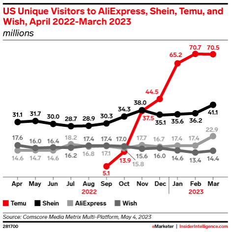 (图 / 2022年4月-2023年3月间,Temu、Shein、速卖通、Wish在美国访问量对比图)
