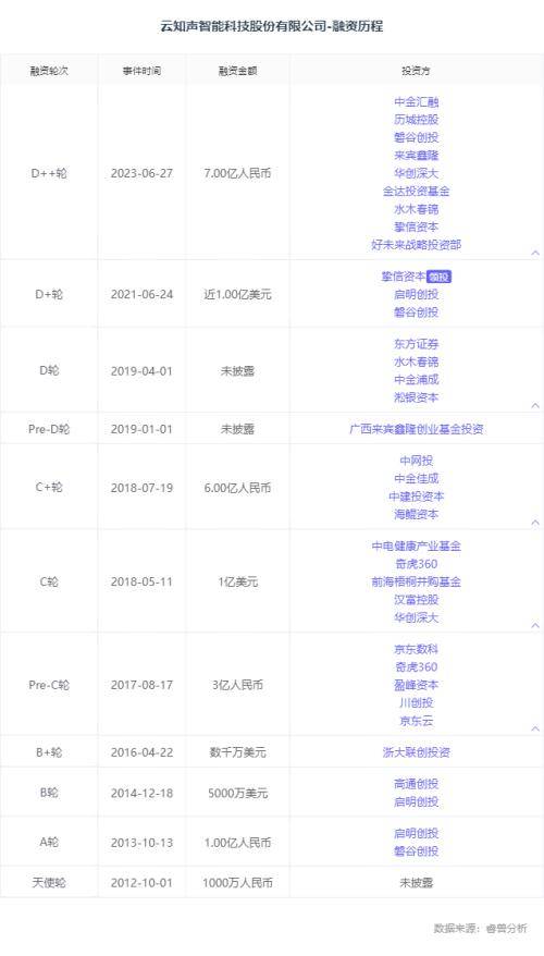 睿兽分析显示,云知声成立的11年间,共完成11轮融资,引入了包括挚信资本、启明创投、磐古创投、中网投、京东、奇虎360、高通创投近30家国内外一线战投机构及国家队基金,累计融资额超20亿元。