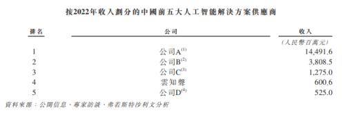 最新招股书显示,根据弗若斯特沙利文的数据,以2022年的收入计算,云知声于中国人工智能解决方案供应商中排名第四。值得注意的是,云知声与前三名收入差距仍较大。