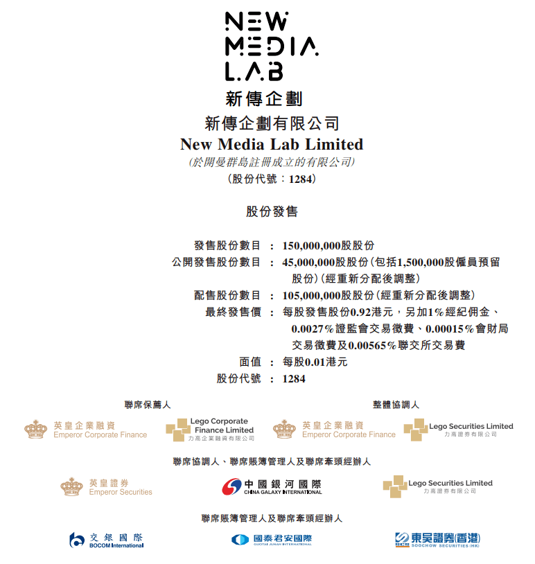 2023年7月18日,新传企划有限公司 New Media Lab Limited(简称"新传企划”)(01284.HK),成功在香港联合交易所主板挂牌上市,其原定7月17日上市,但因当天停市而顺延至18日挂牌。