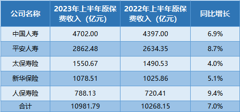 五家A股上市险企2023年上半年原保费收入增速情况表