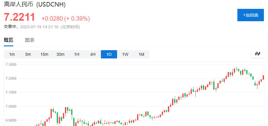 原标题:离岸人民币兑美元跌破7.22 日内跌超300点
