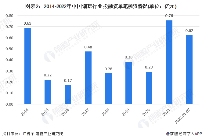 从单笔融资金额来看,2014-2021年中国潮玩行业呈现大幅波动的态势,但始终保持在0.8亿元以下。2014年单笔融资规模为0.69亿元,随后下降至0.5亿元以下,直到2021年潮玩行业单笔融资规模飙升至近五年最大值,达到0.76亿元。截至2022年7月,中国潮玩行业单笔融资规模为0.62亿元。