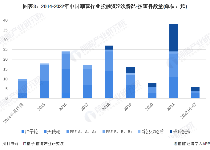 从潮玩的投资轮次分析,目前潮玩行业的融资轮次仍然处于早期阶段,C轮后的融资相对较少且尚无PRE-IPO轮次融资发生。值得注意的是,行业融资轮次有从早期向中后期阶段过渡的趋势,2014-2020年中国潮玩行业融资轮次主要集中在天使轮、A轮及A轮追加轮次、B轮及B轮追加轮次上,而2021年发生战略融资事件数量大幅增加,展现出行业内企业关注自身业务与投资标的的战略协同效应,有稳固主营业务的计划,从一定程度上说明行业处于早期融资阶段。