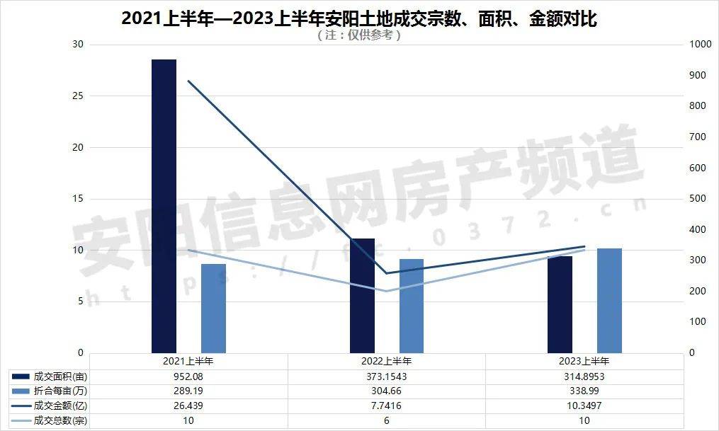 2023上半年安阳市区土地成交共计10宗,成交面积21.45475万㎡(321.8211亩),成交金额10.4871亿元。其中,住宅用地(包含住宅兼容商业)成交9宗,成交面积20.993029万㎡(314.8953亩),成交金额10.3497亿元;医疗卫生用地成交1宗。