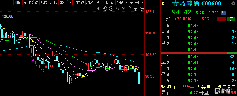 今日,青岛啤酒午后跳水大跌近7%破100元关口,股价创去年11月底新低。截止收盘跌幅收窄至5.75%报94.42元/股,总市值1288亿。