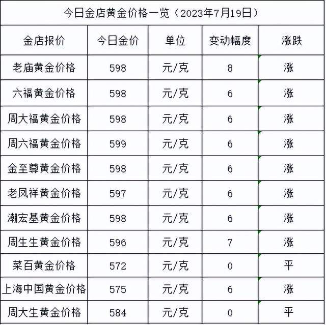今天是7月19日,各大金店黄金价格突现大涨,涨幅高达7元/克左右,金店黄金价格即将来到600元/克,创年度新高,真是不得了。目前,金价最高的金店依旧是是周六福,涨幅高达6元/克,报价599元/克。而金价最低的金店为菜百,价格不涨不跌,报价572元/克。今日黄金价格高低差为27元/克,价差较大。