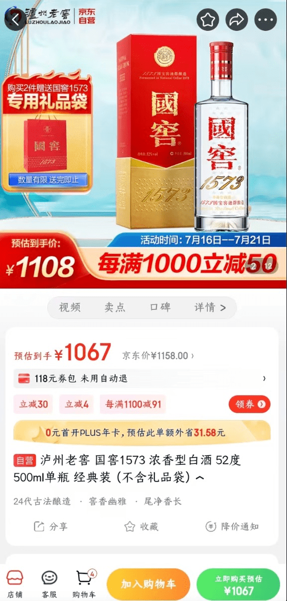 去年泸州老窖还曾因为京东自营在双十一期间,将“国窖1573”的价格底线大幅拉低至1009元,严重影响了泸州老窖的品牌价值和产品价值,因而选择发函暂停与京东的相关合作。截止到今年的7月17日,泸州老窖京东自营官方旗舰店的“国窖1573”52度500ml单瓶经典装的价格为1067元,较泸州老窖官方旗舰店的同款国窖1573的预估到手价少了一百多元。