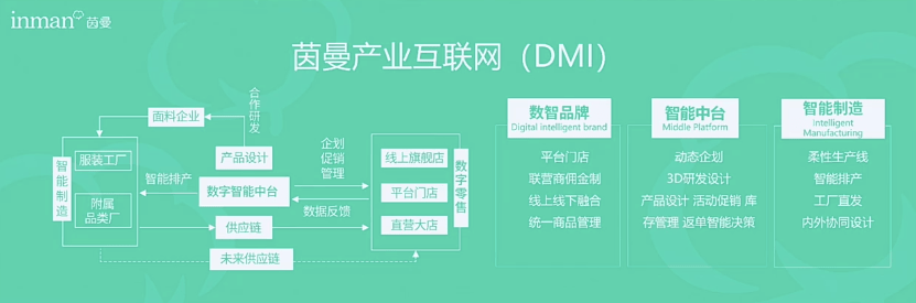 茵曼的产业互联网,第一个是数智化的品牌,加上智能的中台,最后加上智能制造。茵曼平台门店模式是五大统一,驱动整个供应链,我们现在能够做到90%的售罄。