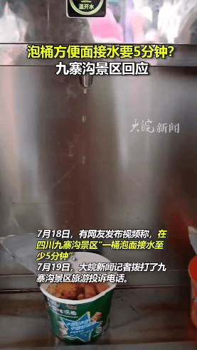 7月18日,有网友发布视频称,在四川九寨沟景区“一桶泡面接水至少5分钟”。视频显示,一个饮水机大约6个出水口下都放着接水的桶装方便面,但是每个出水口的水都非常小,几乎是滴下来的。视频中有游客说“20分钟就接了这么一点。”记者注意到,这些出水口处有注明是“温开水”。