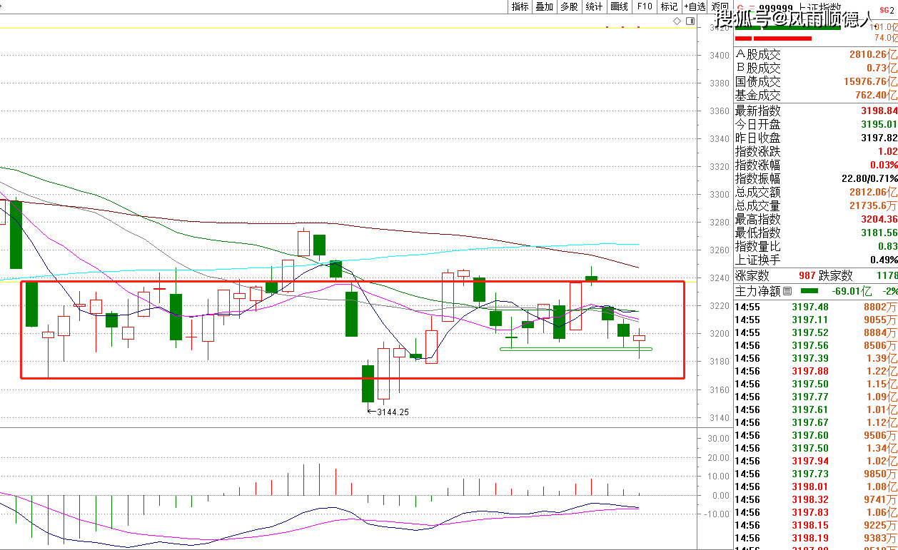 上证指数 下午探底回升,其实重心还是向下的,但没有跌穿绿色的小平台。这几天一直走的是下降通道,从箱顶走往箱底的途中,出现没有力度的回升解决不了任何问题,昨天昨么看今天依然可以怎么看:超短线适当试试高抛低吸也行,但重点布局机会(箱低还在下方)还没有到来。