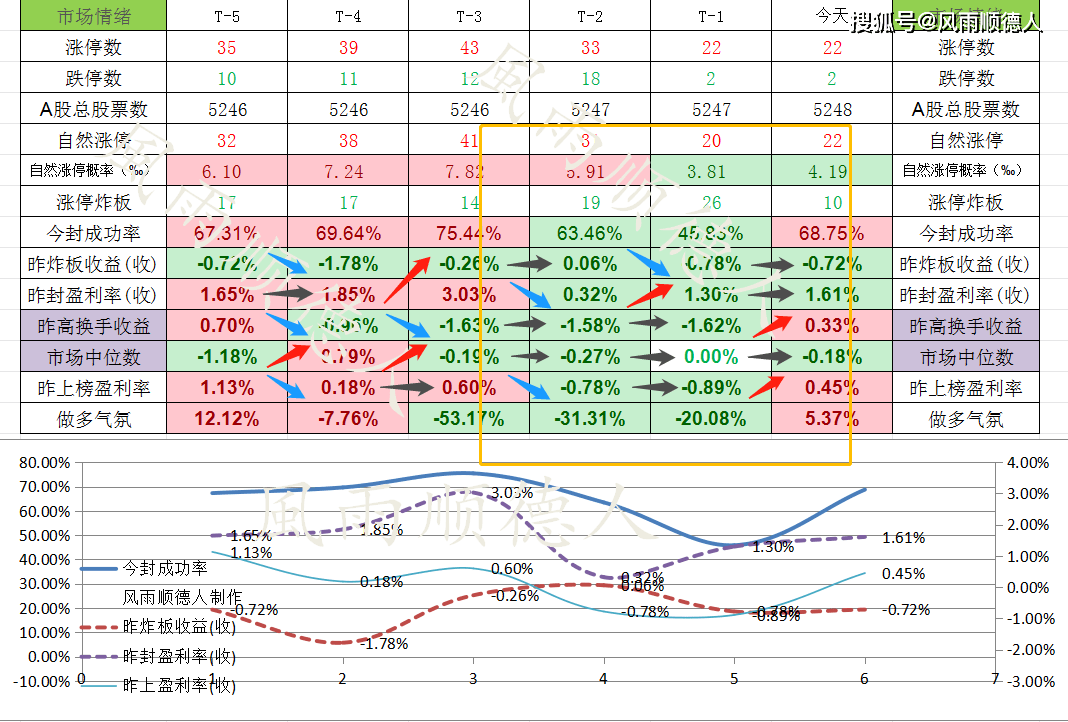 4、短线周期分析:从追板成功率看,今天的成功率低,从个股方面看,炸板收益率正常,封板收益率正常偏低,高换手收益率正常,上榜收益率正常,图形横向发散有两交点,代表观点弱分歧,强势龙头股短线或走弱。