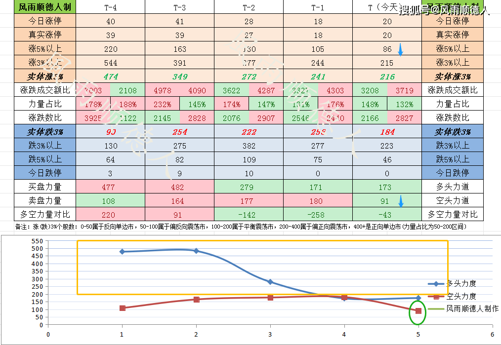 1、整体数据分析:跌3%个股223家,涨3%个股215家,实体涨停20家,当天跌停0家,做多力道173,做空力道91。