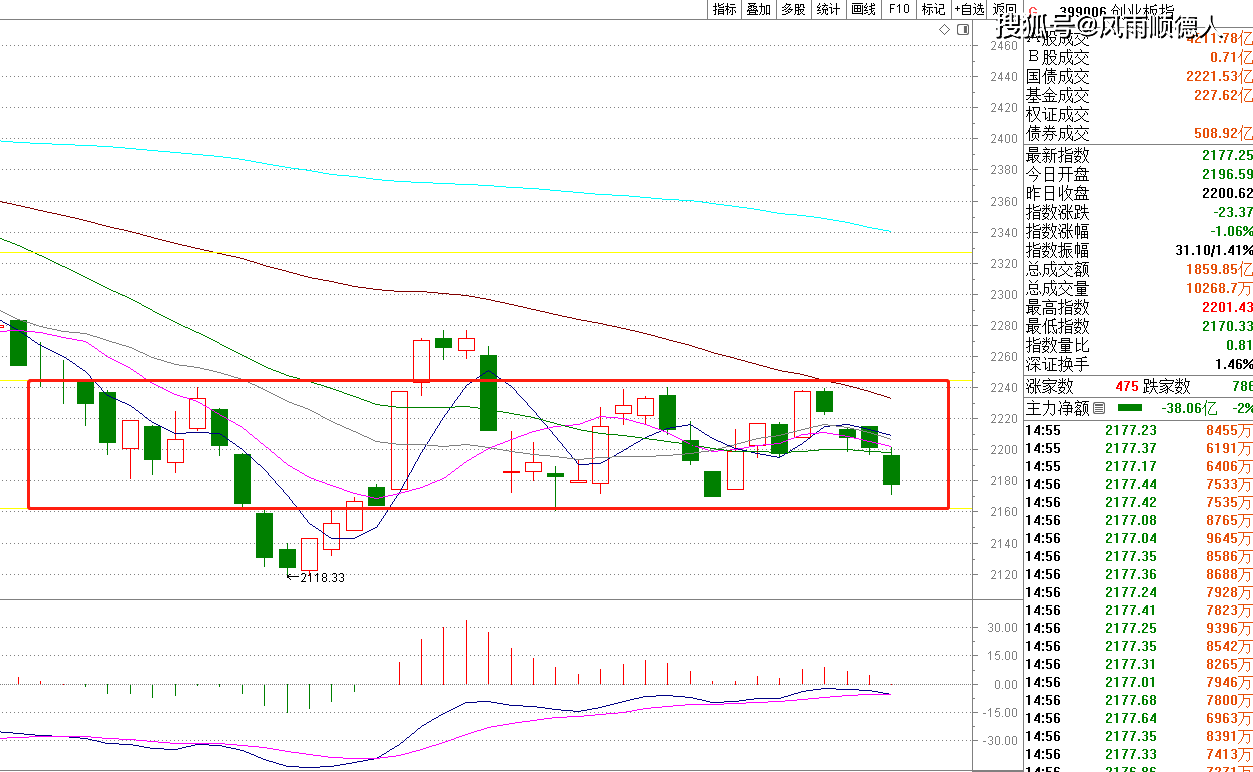 创业板 比上证指数老实多了,就是低位小箱体震荡,今天中阴调整后离箱底还有一些距离,如果明天探底回升企稳了就应该进入反弹周期。不过复盘数据是多空平衡,如果不是多头发力,而是空头发力并跌破箱体,我会继续观望,不会盲目抄底,只有是探底回升方可尝试一次超跌反弹,反弹目标也只看到小箱顶附近。