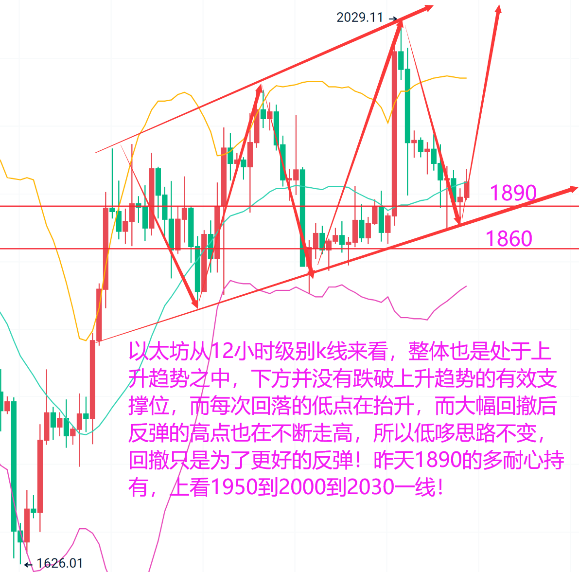 以太坊从12小时级别k线来看,整体依旧处于上升通道的趋势当中,下方并没有跌破上升通道的有效支撑位置,而每次回落的低点也在不断抬高,所以整体也是低多思路不变,回撤只是为了蓄势从而更好的拉升走高,昨天1890跟上老余多单了的,记得分批减仓后,继续耐心持有即可,上看1950到2000以及2030一线,空仓的朋友如果给到1890附近,依旧是可以参与多单的,防守昨天的分析中明确给到,这里就不多说了。
