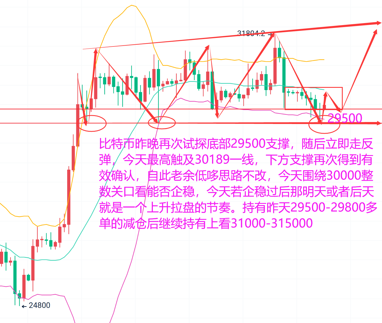 行情没有百分百,我们能做的就是根据规律,在前面的支撑位置去多,然后在前期受阻的压力位去空,昨晚底部支撑29500再次反弹上行,所以老余继续低多看涨不变,今天主要关注30000整数关口的企稳,如果能够企稳慢牛上涨的话,那么明后两天必然就会有大幅的拉盘节奏,持有昨天29500跟29800多单的朋友继续耐心持有,减仓后上看31000到31500一线,没有多进去的,可以找位置低多进去,比如29800这里,防守跟止盈的话,保持昨天的思路不变,你们可以去翻阅,这里不再次强调!