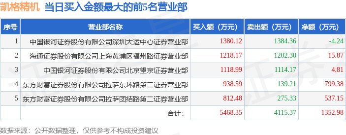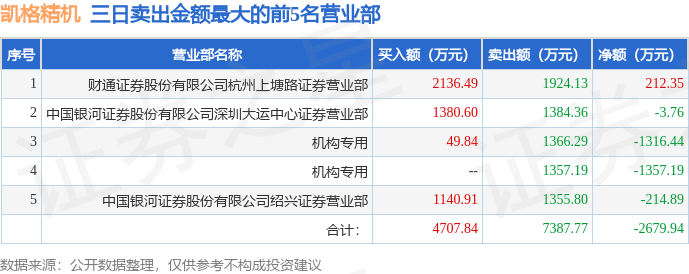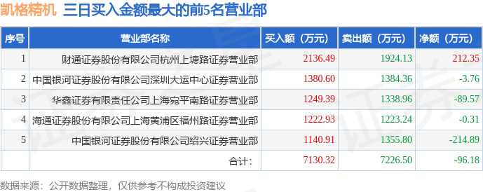 沪深交易所2023年7月19日公布的交易公开信息显示,凯格精机(301338)因日换手率达到30%的前5只证券,连续三个交易日内,涨幅偏离值累计达到30%的证券登上龙虎榜。此次是近5个交易日内第2次上榜。