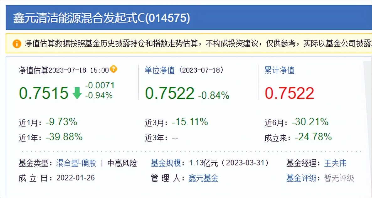 公开信息显示,这两只产品成立于2022年1月26日,迄今不过1年零6个月,资产规模均很小,目前,产品C规模为1.13亿,产品A规模仅0.53亿(截至2023年3月31日)。天天基金网数据显示,成立以来,鑫元清洁能源混合发起式C跌幅24.78%,近一年跌幅39.88% ;近1月、3月、6月,业绩均为负数;今年以来,跌幅25.94%,在全部开放式基金中,业绩倒数第十。
