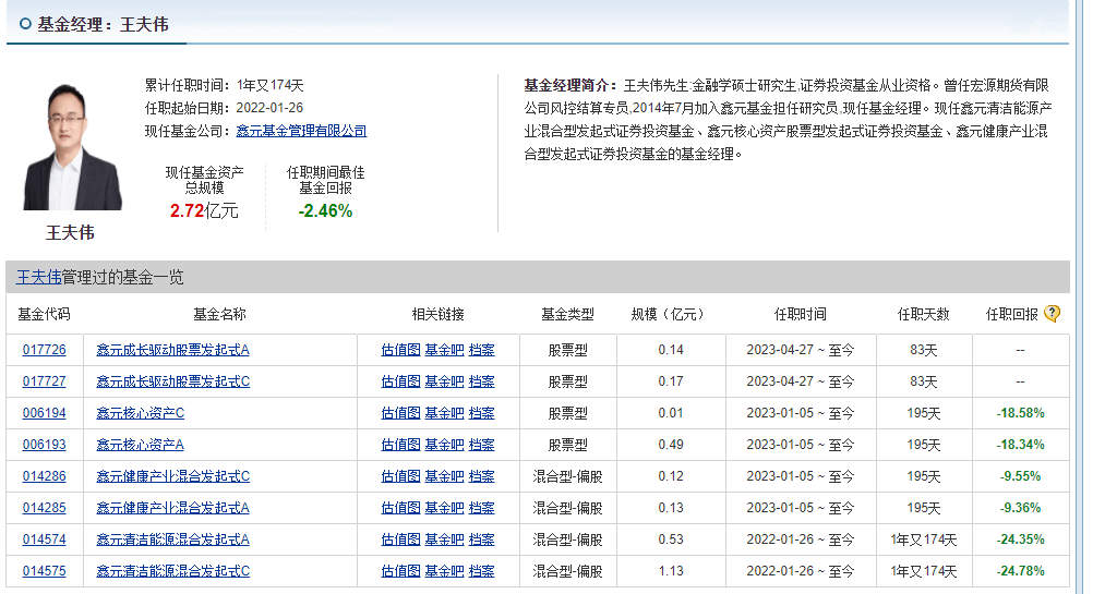 鑫元基金另一位权益投资基金经理王夫伟,累计任职时间1年又174天,在管资产2.72亿,任职最佳回报-2.46%。