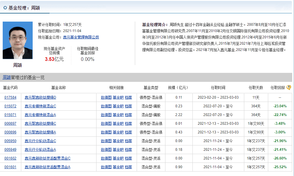 显然,鑫元专精特新混合A的基金经理周颖,在这只基金成立以来的投资业绩,远远跑输行业基准。公开信息显示,周颖是在2021年7月来鑫元基金后,才开始担当基金经理的,其现任6只产品,任期回报全都跌超20%。
