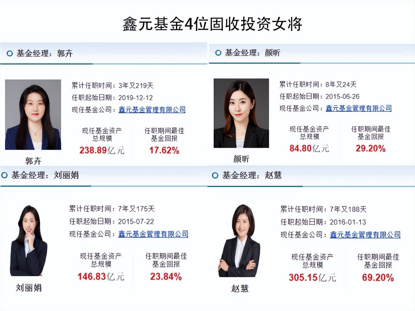 根据天天基金网的数据,鑫元基金公司内,刘丽娟、赵慧、郭卉、颜昕这4位固收女将,现任资产合计775.67亿, 且绝大多数都是她们单独管理;她们的任职年限1位8年以上,2位超过7年,最少的郭卉,也有3年又219天。